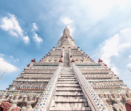 Symbole emblématique de Bangkok, Wat Arun, ou le Temple de l’Aube, est l’un des monuments les plus reconnus de Thaïlande. Situé sur les rives du fleuve Chao Phraya, ce temple impressionne par ses tours (prang) ornées de mosaïques de porcelaine et de céramique, qui captent la lumière du soleil et scintillent de mille feux à l’aube et au crépuscule.