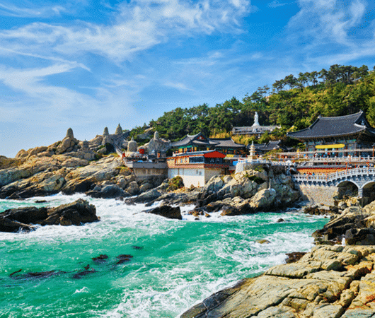 Le temple Haedong Yonggungsa, construit au 14ème siècle est un incontournable d’un voyage en Corée du Sud. Magnifiquement décoré, posé au bord des rochers et avec la mer en fond, le cadre est idyllique et enchanteur. Ce temple bouddhiste, dédié à la déesse de la miséricorde attire de nombreux voyageurs, il est conseillé de s’y rendre tôt le matin pour éviter la foule, en période de haute fréquentation touristique.